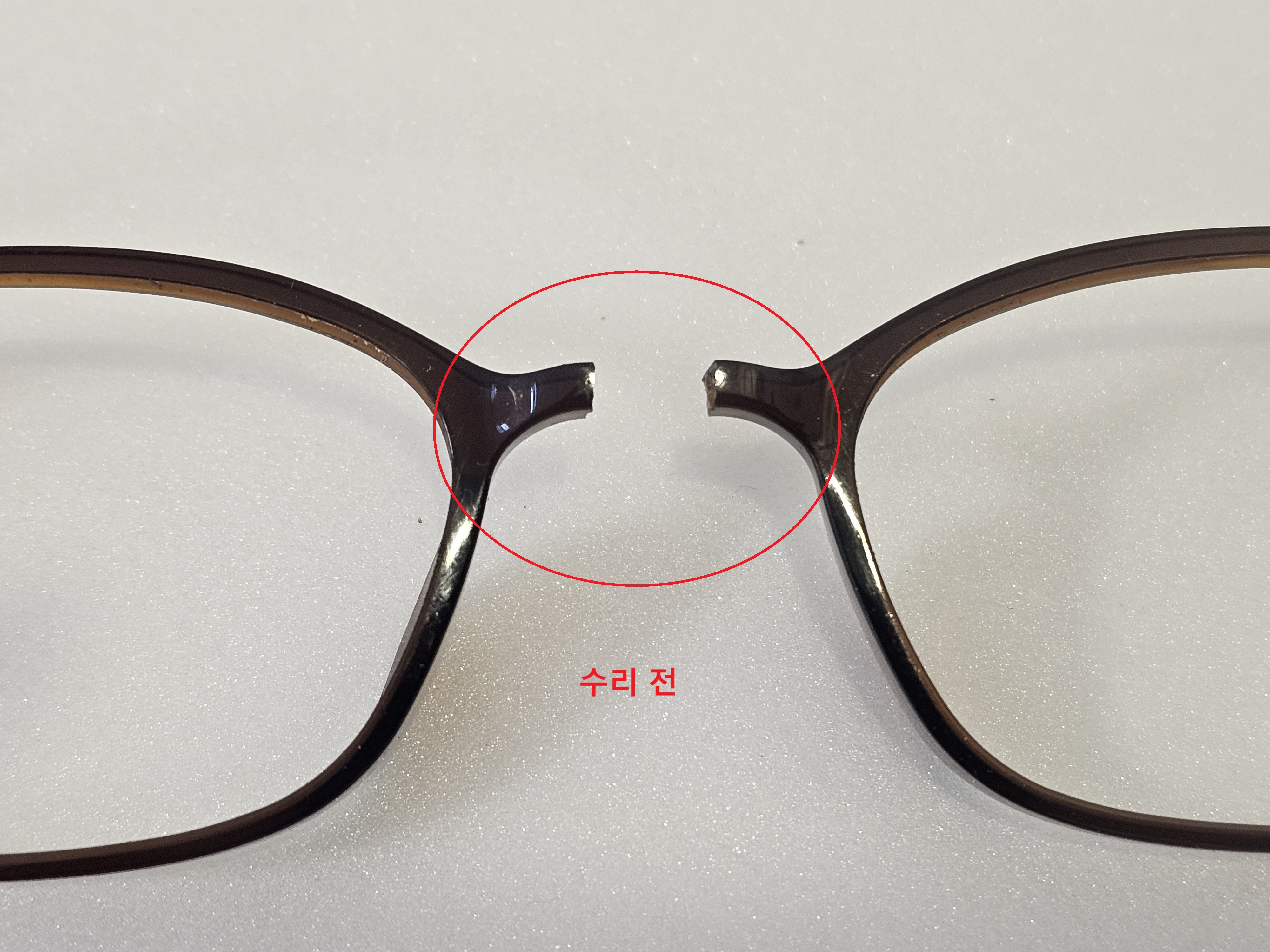 안녕하세요 목포 이마트 안경원입니다 오늘은 울템(뿔테) 브릿지 수리입니다 이마트 안경원 판매 제품은 아니지만 안경을 새로 하시면서 수리를 의뢰하셨습니다 다행히 이마트 안경원 거래처라서 부품 교환으로 진행하겠습니다
