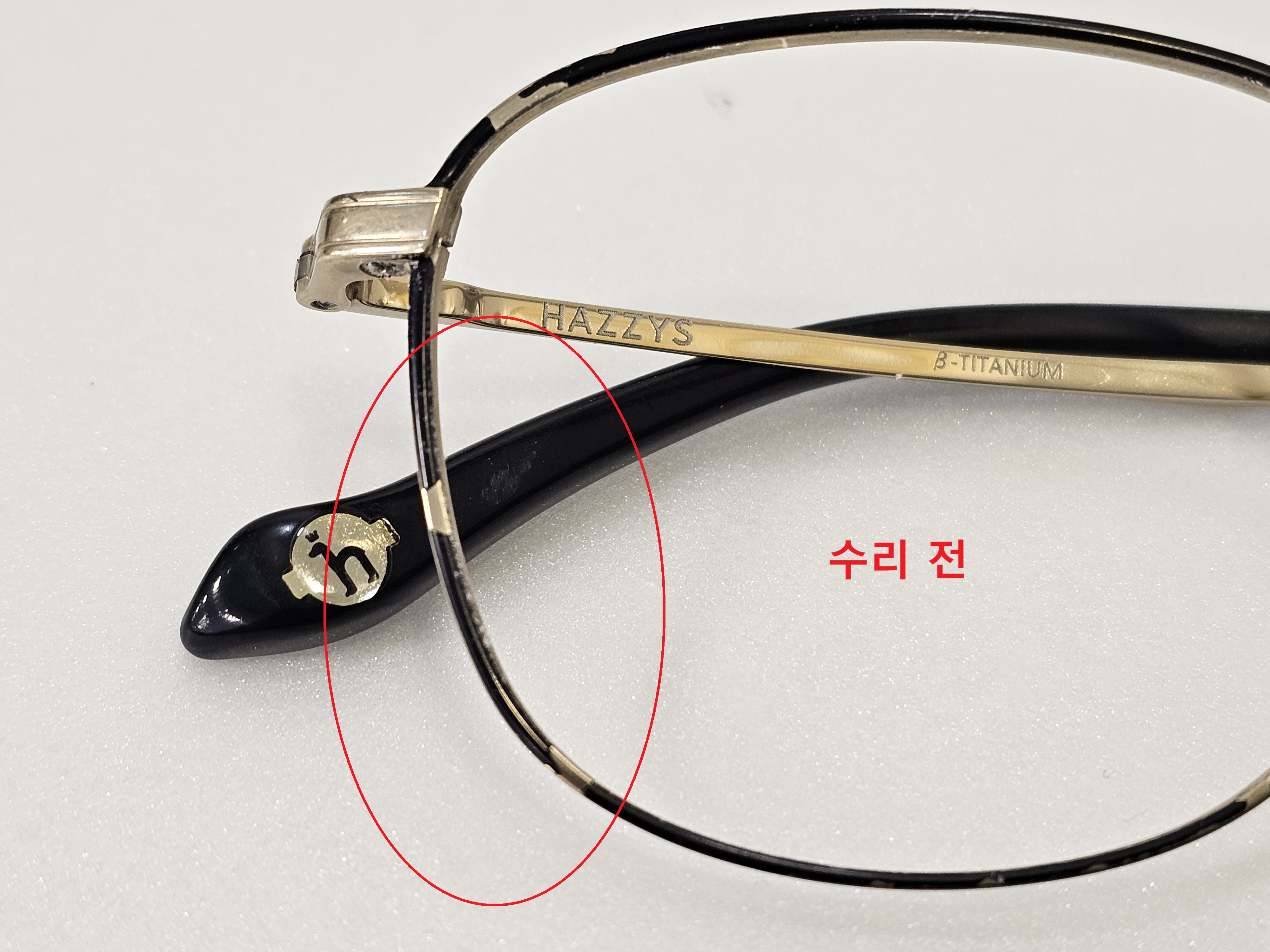 안녕하세요 목포 이마트 안경원입니다 오늘 수리건은 칠보(전면컬러) 입니다 약 5년전에 하셨던 안경인데 잘사용하시 다가 전면부 컬러(칠보) 가 까져서 수리 접수되었습니다 깨끗하게 수리 해 보겠습니다