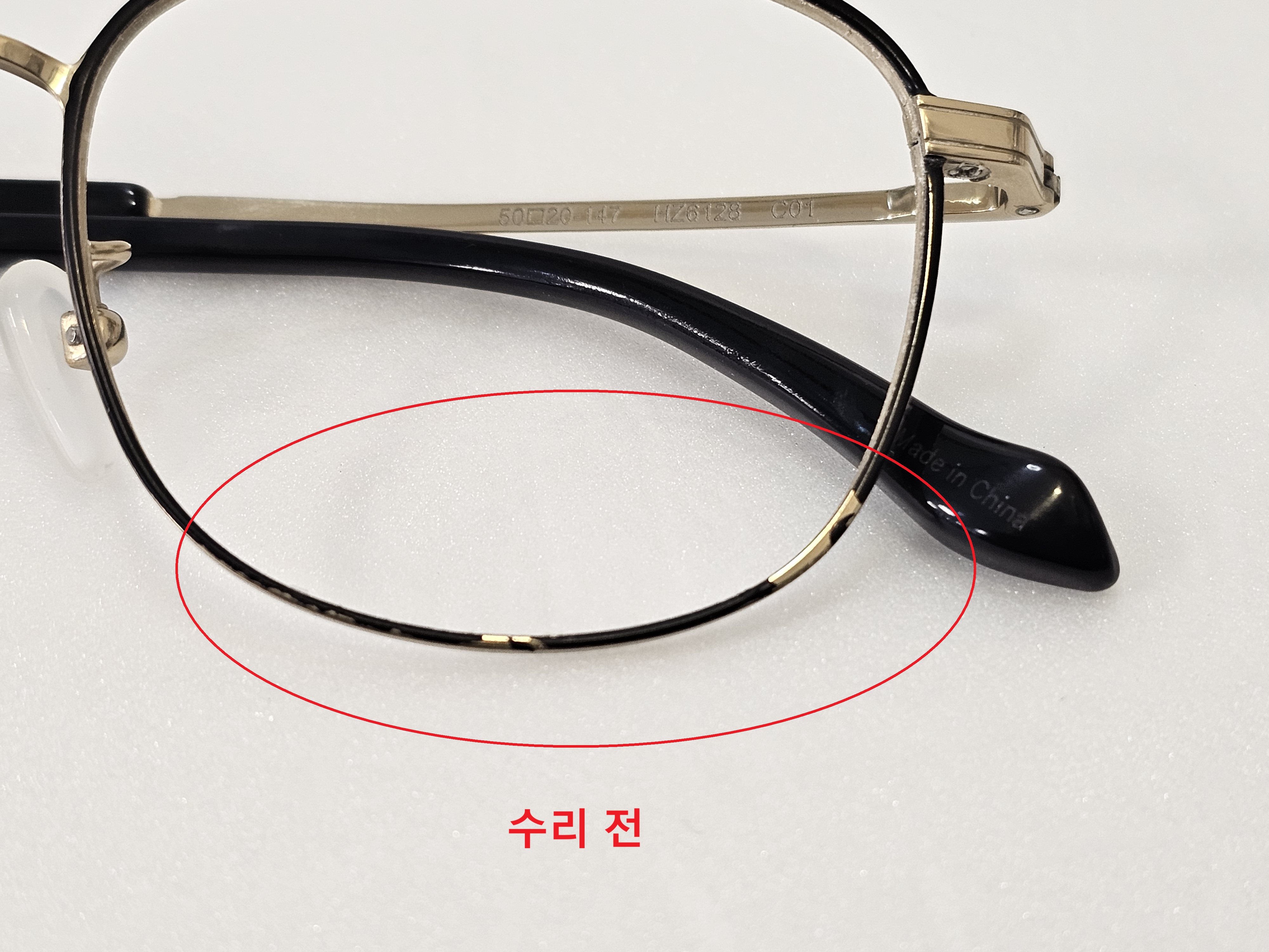 안녕하세요 목포 이마트 안경원입니다 오늘 수리건은 칠보(전면컬러) 입니다 약 5년전에 하셨던 안경인데 잘사용하시 다가 전면부 컬러(칠보) 가 까져서 수리 접수되었습니다 깨끗하게 수리 해 보겠습니다