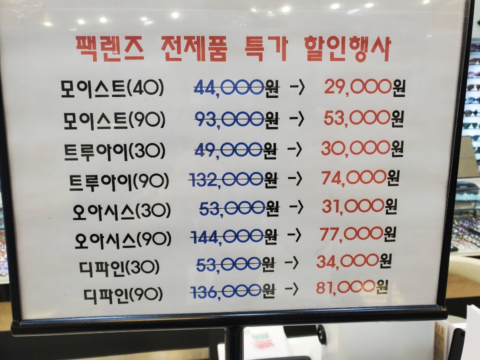 사진에는 없지만 일회용 렌즈 전 제품을 최대 50% 이상 활인 판매하고 있습니다